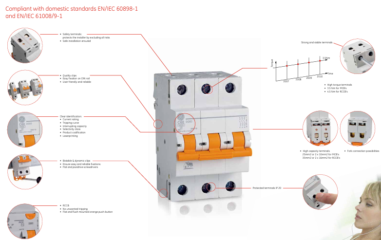 The GE Industrial Solutions New DMS-line offers a comprehensive range of electrical protection devices for domestic installations. These products are compliant with domestic standards EN/IEC 60898-1 and EN/IEC 61008/9-1. Key features include: